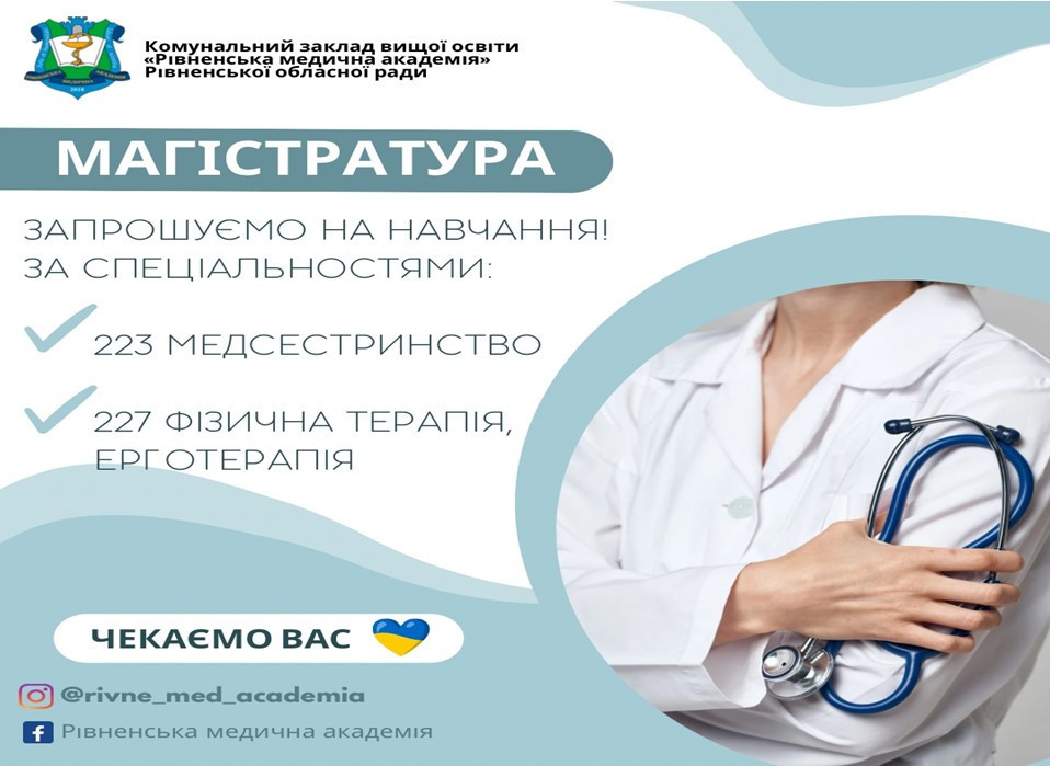 АКАДЕМІЯІнформація для вступу на БАКАЛАВРАТ та МАГІСТРАТУРУ в КЗВО «Рівненська медична академія»КОЛЕДЖІнформація для вступу Фаховий медичний коледж КЗВО «Рівненська медична академія» |