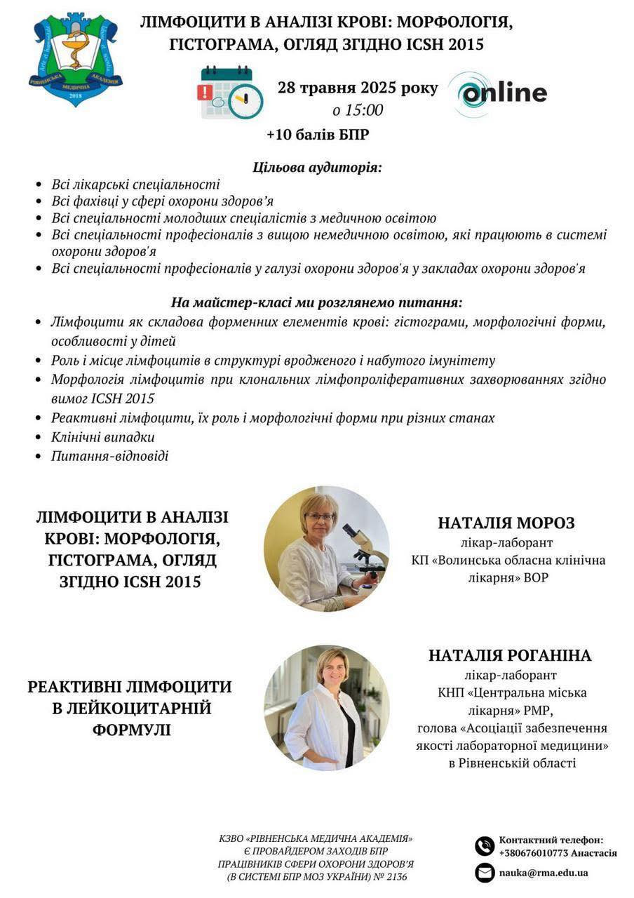 Майстер-клас мав практичне спрямування, супроводжувався демонстрацією зразків мікроскопічних препаратів і сприяв підвищенню рівня знань фахівців щодо диференційної діагностики змін у лімфоцитарному ряду.