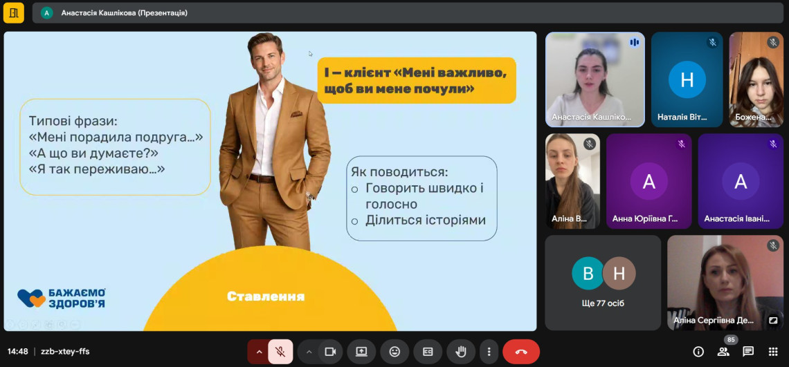 Розглянули основні типи поведінки клієнтів (Dominance, Influence, Steadiness, Compliance), психологічні особливості кожного типу, ефективні способи комунікації з різними категоріями відвідувачів аптек, практичні рекомендації щодо побудови довіри та зниження конфліктних ситуацій.