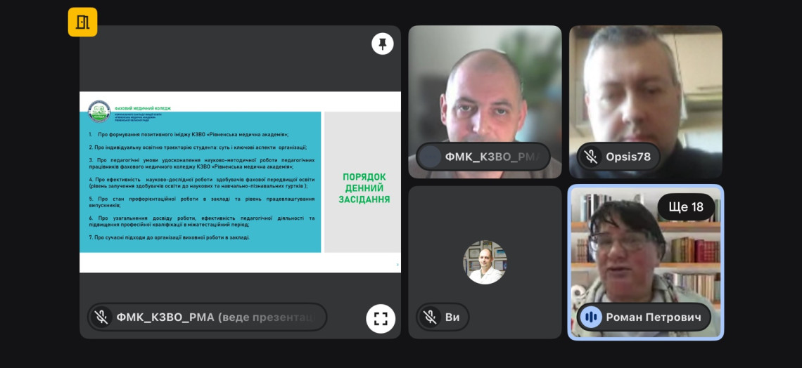 27 лютого 2026 року пройшло чергове засідання педагогічної ради фахового медичного коледжу КЗВО «Рівненська медична академія». Розпочав засідання ректор Академії Роман ШУСТИК, який акцентував увагу присутніх на формування позитивного іміджу закладу освіти. Пріоритетними завданнями розвитку КЗВО «Рівненська медична академія» є підвищення якості навчання здобувачів освіти через інноваційні технології, професійний розвиток науково-педагогічних та педагогічних працівників, створення безпечного освітнього середовища, забезпечення інклюзивності, ефективне управління, що в результаті формують позитивний імідж навчального закладу. Як зазначив Роман Петрович, потужним інструментом у трансформації медичного закладу є ребрединг — стратегія зміни бренду; тому оновлення айдентики, такої, яка б мотивувала б усіх учасників освітнього процесу та відповідала сучасним вимогам, є сьогодні актуальним. На розгляд колективу було винесено декілька варіантів емблеми закладу, остаточний варіант якої був схвалений педагогами відкритим голосуванням. Директор коледжу Дмитро ЛИСИЦЯ проаналізував суть і ключові аспекти організації індивідуальної освітньої траєкторії студента. Перший проректор Руслана КОНОЩУК та начальник навчально-методичного відділу Інеса ХМЕЛЯР звернули увагу присутніх педагогічних працівників на педагогічні умови удосконалення науково-методичної роботи у коледжі. Проректор з наукової роботи Оксана ШТРІМАЙТІС наголосила на важливості науково-дослідної роботи здобувачів фахової передвищої освіти, залучення студентів до участі у наукових та навчально-пізнавальних гуртках. Про стан профорієнтаційної роботи та рівень працевлаштування випускників доповідала Ольга Остапчук. Одним із ключових питань засідання педагогічної ради було узагальнення досвіду роботи, ефективність педагогічної діяльності та підвищення професійної кваліфікації педагогічних працівників в міжатестаційний період. Також на педагогічній раді було проаналізовано сучасні підходи до організації виховної роботи, про які розповіла заступник директора коледжу Світлана БУХАЛЬСЬКА.